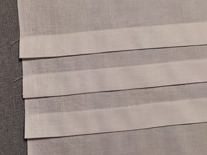 3. Następnie podwijamy tkaninę na szerokość 7,5cm, zaprasowujemy. I jeszcze raz podwijamy na szerokość 7,5 i zaprasowujemy – powstają zakładki druga i trzecia.