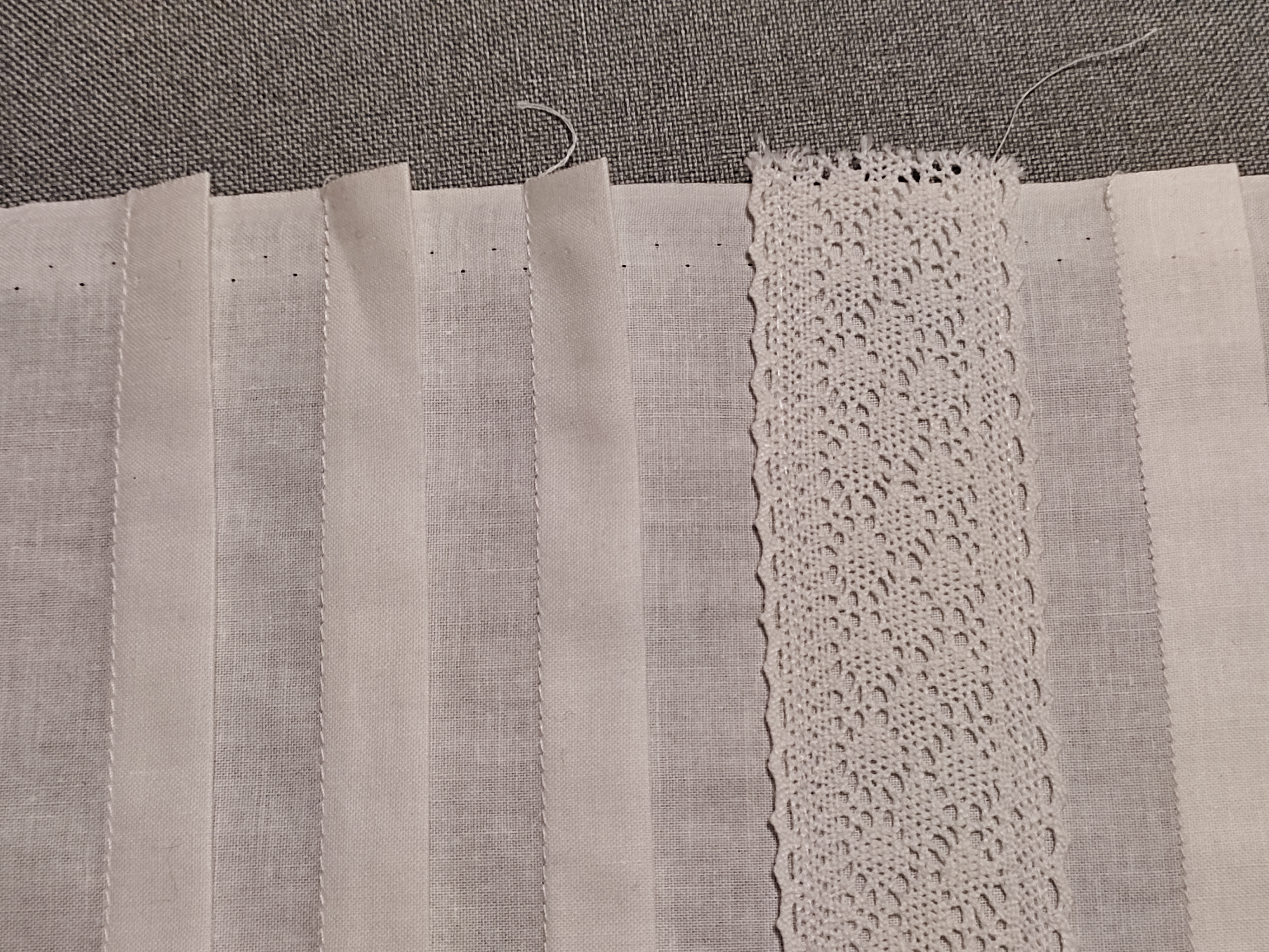 • Na zdjęciu widoczna lewa strona zapaski z przeszytymi dwukrotnie złożonymi brzegami tkaniny, koronka widoczna jest między szwami mocującymi ją do zapaski.