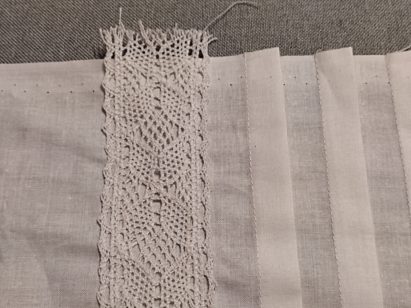 9. 1,5cm nad zakładkami przyszywamy drugą z dwóch koronek przeznaczonych na pasy szyjąc 4-5mm od krawędzi koronki.